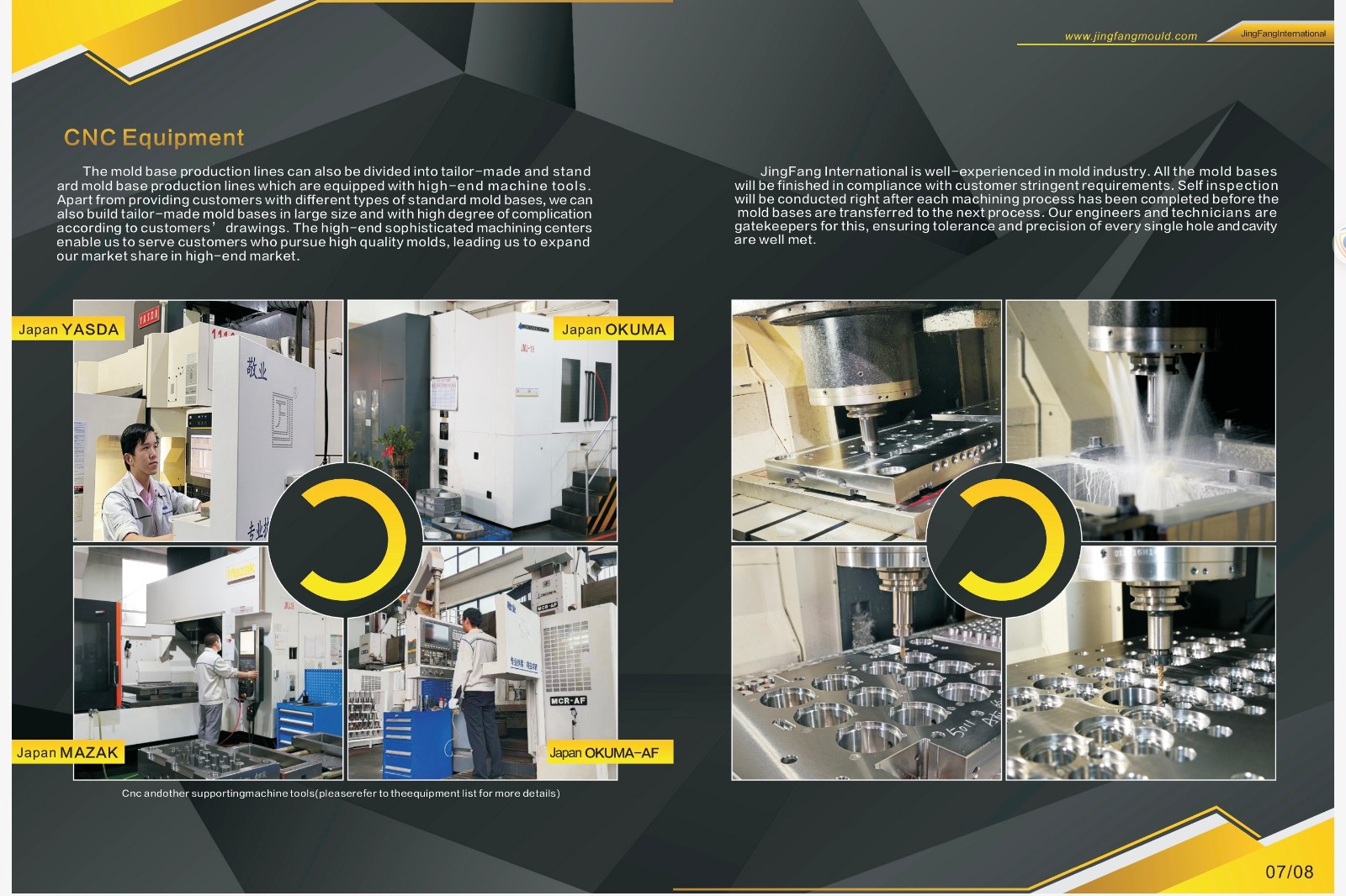 L'équipement de production se compose principalement de machines de précision telles que YASDA, OKUMA, MAZAK du Japon, DAHLIH de Taïwan, Gaofeng de Taïwan, Huadu Precision et Zhongyou Precision Machinery. Il y a plus de 100 centres de traitement. L'équipement complémentaire comprend des fraises porteuses, des rectifieuses porteuses, des rectifieuses de précision, des machines de finition, etc. De plus, l'entreprise dispose d'une excellente équipe avec 20 ans d'expérience dans la fabrication de structures de moule de précision. Du réception de la commande du client à la production, l'assemblage du moule et l'expédition, la qualité et le service de Jingmin International vous feront certainement ressentir une supériorité.